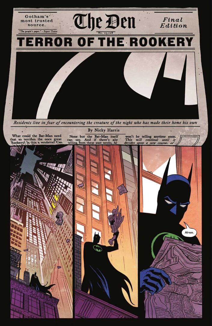 Triona Farrell’s colouring also perfectly captures the story’s nostalgic aesthetic, using muted colours that still contrast with the shadows, ensuring that Batman stands out even in the darkest places. In fact, the comic is surprisingly full of colour, not just because fire is a recurring visual element. Gotham is not a black hole of despair, it’s alive.