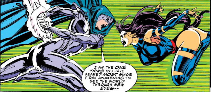 There are more X-Men than ever! So much in fact that two field squads were created at the start of the nineties. Psylocke joined the Blue team led by Cyclops and would even become flirtatious with him for a short time. Chris Claremont left the X-Men after the third issue, and Jim Lee after issue #11. Fabian Nicieza (Deadpool co-creator) took over and would go on to try to give an explanation for Betsy’s Japanese physical appearance.